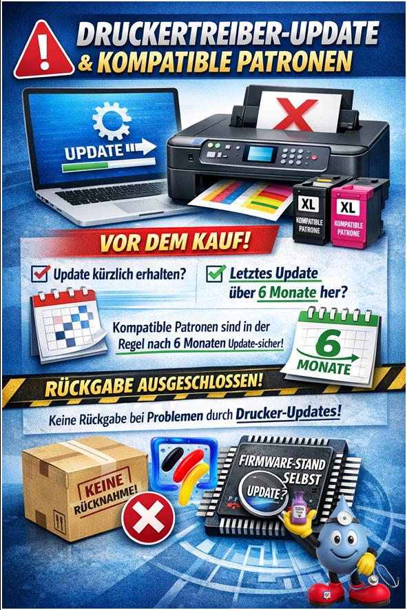 Ingo Schacht2026-04-01T07:31:56+02:00Wichtiger Hinweis zur Verwendung kompatibler Druckerpatronen Bitte beachten Sie vor dem Kauf und der Installation Ihrer neuen Patronen die folgenden Informationen bezüglich Drucker-Firmware und Treiber-Updates: Druckerhersteller veröffentlichen regelmäßig Software-Updates (Firmware), die unter anderem dazu dienen können, die Funktion von kompatiblen Tintenpatronen von Drittanbietern zu blockieren. Um eine reibungslose Nutzung zu gewährleisten, ist Ihre Mitwirkung erforderlich: [...]